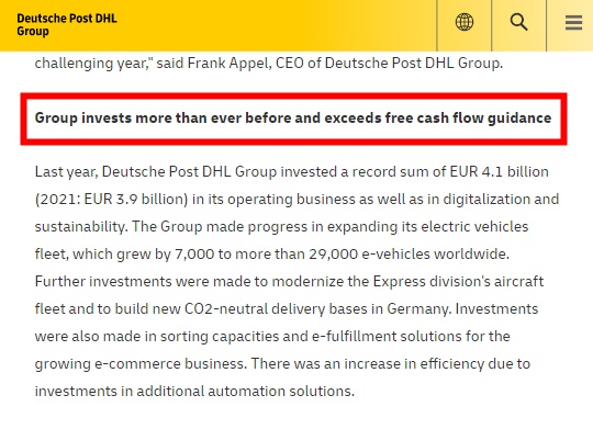 不包括收购,德国邮政敦豪集团自由现金流达到46亿欧元的历史新高。因此,自由现金流高于42亿欧元的最新预期,并超出2022年3月最初提供的指引约10亿欧元。包括收购和资产剥离在内的自由现金流达31亿欧元。总计15亿欧元的收购和撤资付款主要用于收购海运专家Hillebrand,其子公司已无缝整合到DHL Global Forwarding的货运部门。