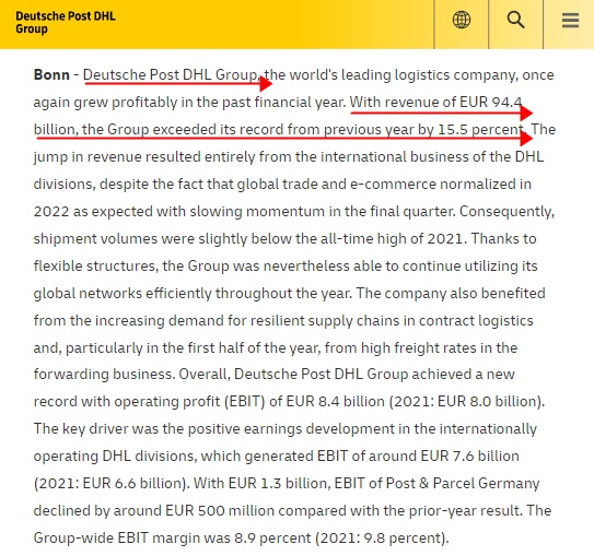 3月10日消息,德国邮政敦豪集团(DHL)日前发布2022财年全年业绩报告。2022年该集团的收入为944亿欧元,比上一年的记录高出15.5%,收入的增长完全来自DHL部门的国际业务。