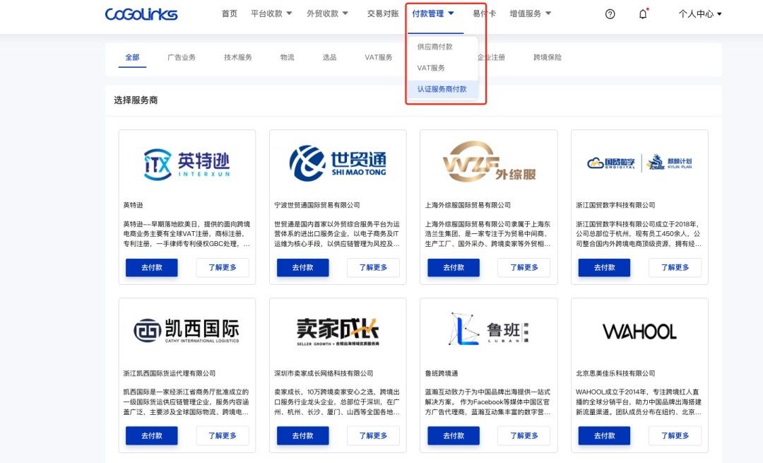 登陆CoGoLinks官网,点击付款管理——认证服务商付款,进入认证服务商付款页面;选择想要付款的服务商,点击“去付款”进入付款页面,填写详细信息发起付款。
