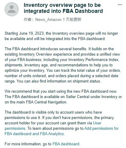 与此同时,亚马逊美国和日本最近宣布,从6月19日起将不再提供库存概览工具页面,并将合并到亚马逊物流(FBA)的控制面板中。基于现有的库存概览页面,FBA控制面板可以提供卖家FBA业务的全面视图,包括库存绩效指标、交付、库存天数以及优化库存的建议。