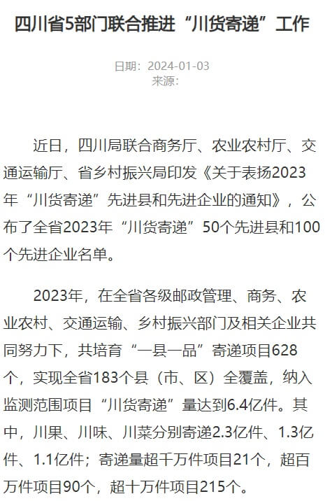 四川局联合商务厅、农业农村厅、交通运输厅、省乡村振兴局近日印发《关于表扬2023年“川货寄递”先进县和先进企业的通知》,公布了全省2023年“川货寄递”50个先进县和100个先进企业名单。